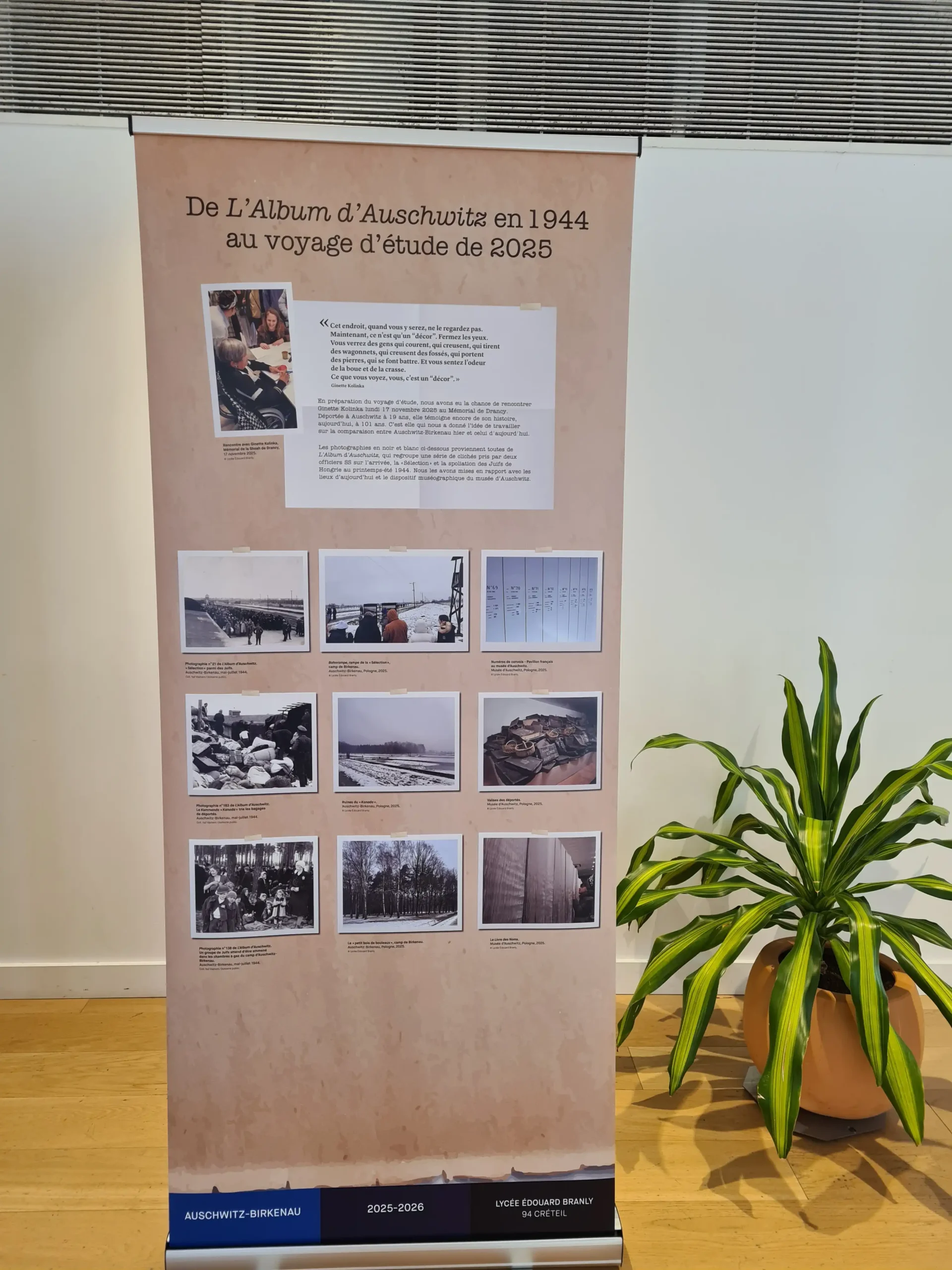 Comment rendre compte de ce qui s’est passé sur ce site alors qu’il ne reste pratiquement rien ? C’est la phrase de Ginette Kolinka, « Ce que vous verrez, c’est un décor », qui nous a guidés dans notre réflexion. Notre panneau portait sur une mise en relation entre des photographies issues de l’Album d’Auschwitz (printemps 1944), les mêmes lieux photographiés aujourd’hui et un dispositif muséographique associé.